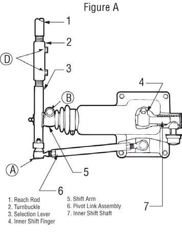 4. Loosen the capscrew B (see figure A) and remove the shift arm from the inner shift shaft. Do not disconnect the selection lever from the shift arm.