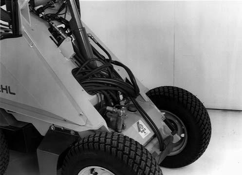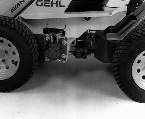 Each wheel is driven by a hydraulic motor coupled with a drive chain. To adjust drive chain tension, loosen the four motor mounting bolts and move the motor with the two adjusment bolts and lock nuts. The chains should be adjusted to have 1/4″ (6 mm) or less of slack with 10 lbs (45 N) of force, but should not be adjusted so the chain is tight.