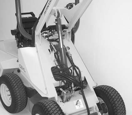 The loader is equipped with an 8 gallon (30 L) hydraulic revervoir. The loader is provided with a dipstick on the hydraulic reservoir cap. Markings on the dipstick represent both full and low (add oil) levels. The resevoir is accessed by raising the lift arms and removing the front Cover. Use hydraulic oil with anti-wear, anti-foam and anti-oxidation additives that conforms to ISO Viscosity Grade 46, such asMobil DTE 15M, Amoco Rykon 46, or BP Energol HLP-HD 46. Use of synthetic hydraulic fluids is not permitted. The hydraulic oil should be changed every 500 hours (or annually).