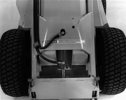 3.Lower lift arm completely and place attachment flat on the ground. However, if the lift arm MUST be left in the “raised” position, BE SURE to properly engage the lift cylinder mechanical lock.