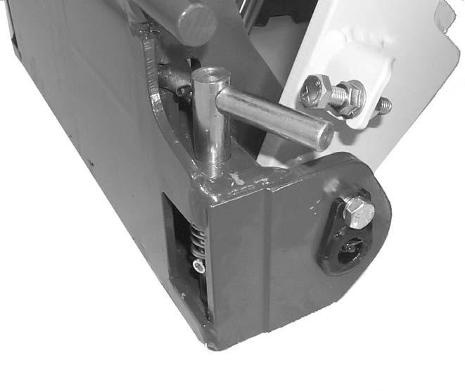 6.Stop forward travel when the hooks are engaged but, continue to tilt the attachment mechanism back to pick the attachment up off the ground. When the attachment plate mechanism is fully tilted back, bolts on the load arm contact the locking pins to move them into the locking position. When the attachment mechanism is rolled back completely, exercise the MANDATORY SAFETY SHUTDOWN PROCEDURE (page 8)