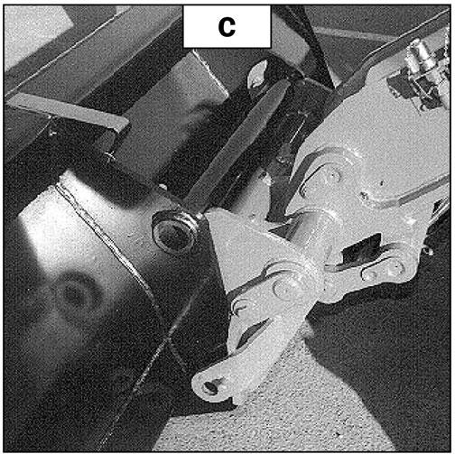 -Bring the carriage under the locking tube of the attachment, slightly lift the boom, and tilt the carriage rearward to position the attachment (fig. C).