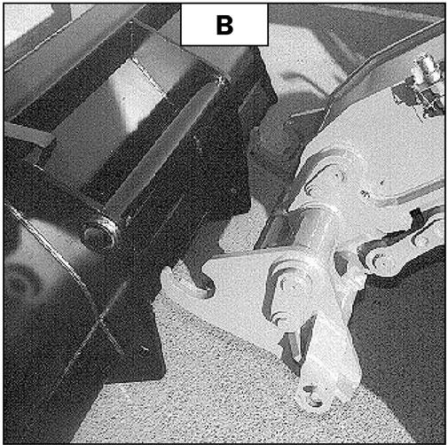 -Park the telescopic handler with the boom lowered in front of and in line with the attachment. Tilt the carriage forward (fig. B).