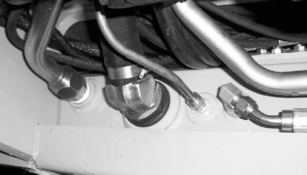 Clean all dirt and debris from around the area where the hydraulic system suction (large) hose connects to the wall of the reservoir.
