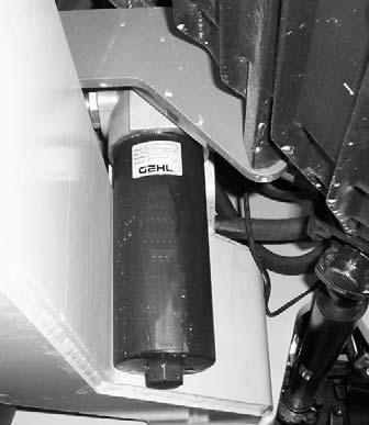 The hydraulic return filter element is a cartridge-type, accessible from underneath the chassis. Initial replacement is after the first 100 hours. Unscrew the filter cover and remove. Slide off the old element and discard. Insert the new element onto the housing and replace the cover.