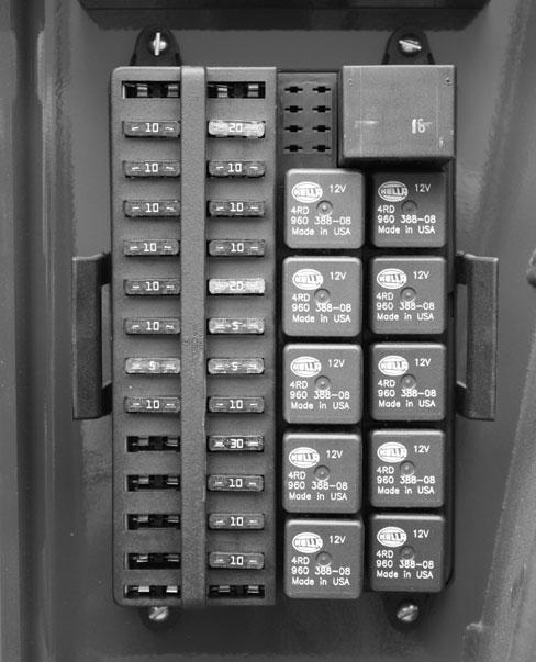 Storage Compartment Fuse and Relay Box: This box is located on the front inside wall of the storage compartment behind the operator’s compartment. A decal provides a quick reference guide for troubleshooting electrical functions.