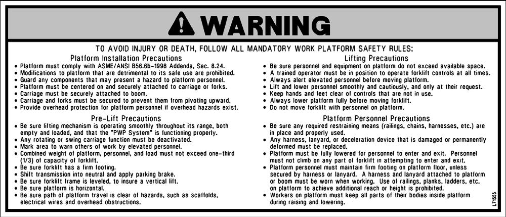 Read and thoroughly understand all safety decals on the Telescopic Handler BEFORE operating it. DO NOT operate the machine unless all factory-installed guards and shields are properly secured in place.