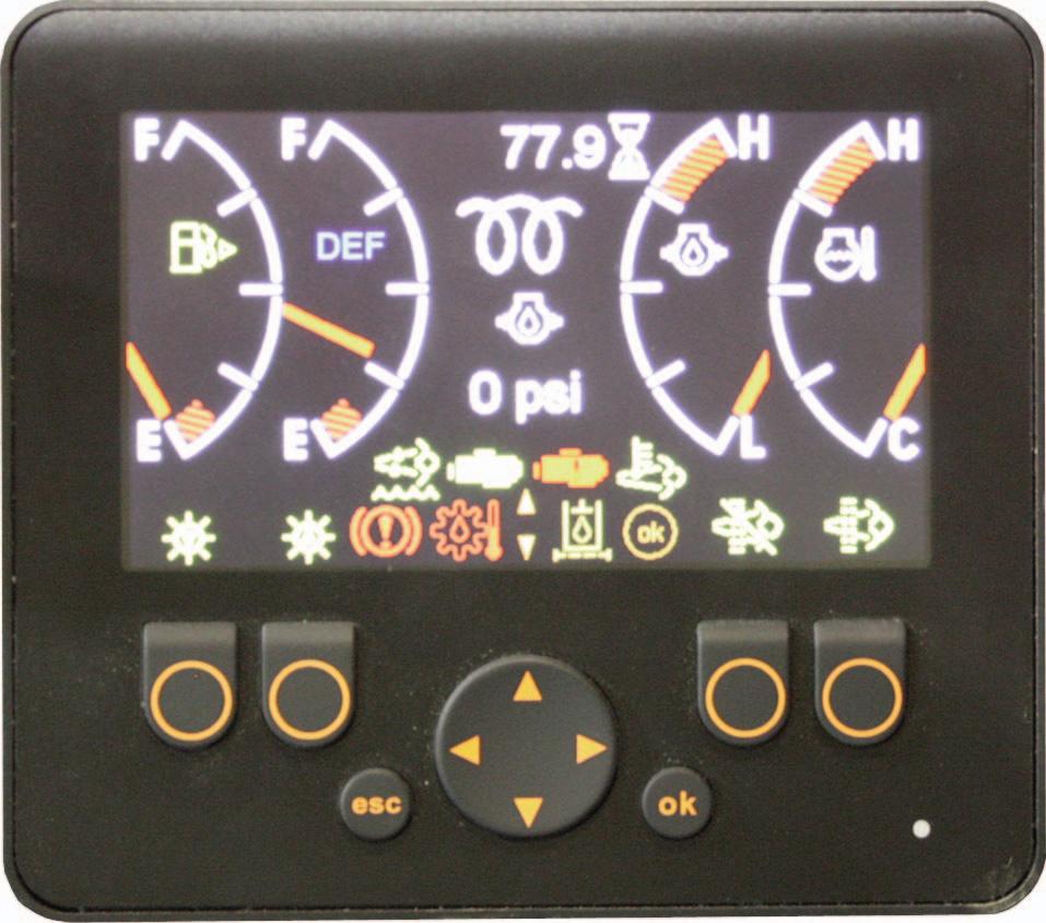 This multi-functional panel displays the gauges for the fuel level, diesel exhaust fluid (DEF) level, engine oil pressure and coolant temperature.