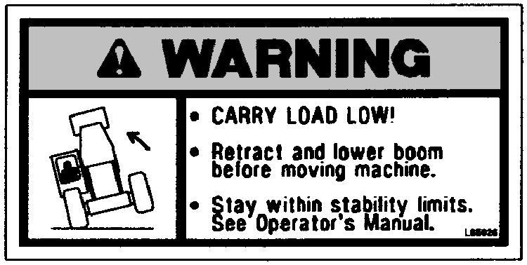 DO NOT level the frame with the boom raised or extended. Level the frame ONLY while stopped, with the boom fully retracted and the attachment raised just enough to clear the ground.