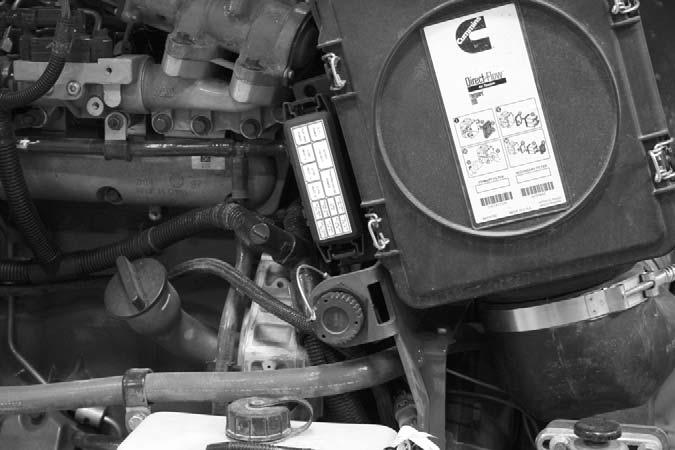 Engine Compartment Fuse and Relay Box: This fuse and relay box is located directly to the rear of the air cleaner assembly. Remove the cover to access the relays and fuses. The cover has a decal indicating the fuse and relay functions.