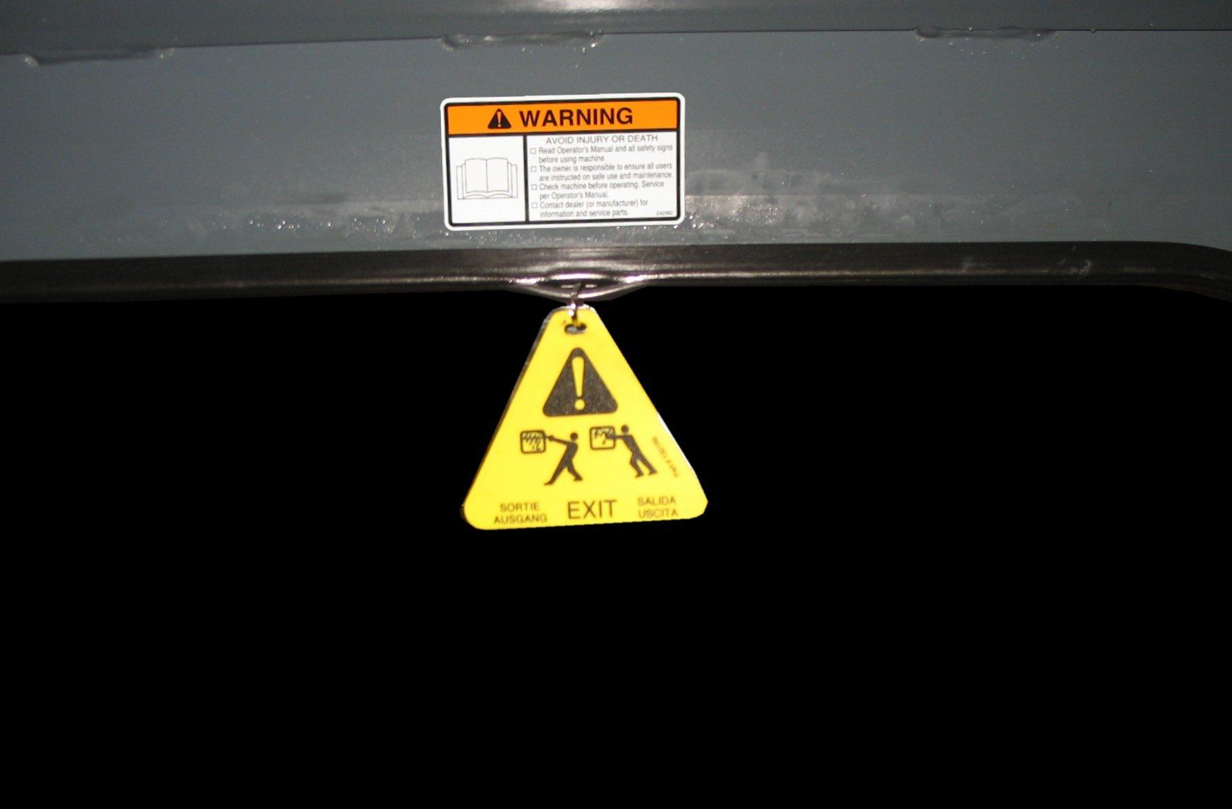 To use the emergency exit function, pull on yellow warning tag (M, Figure 10) at the top of the windowandremove the seal. Push or kickoutthewindow to allow exit from the machine.