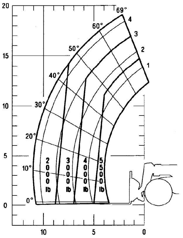 A typical load zone chart is shown below. The scale on the left indicates height in feet above the ground level. The scale on the bottom shows the distance in feet out from the front of the machine. The arc lines noted by the numbers “1” through “4” correspond to the position extension markers on the operator side of the inner boom section.