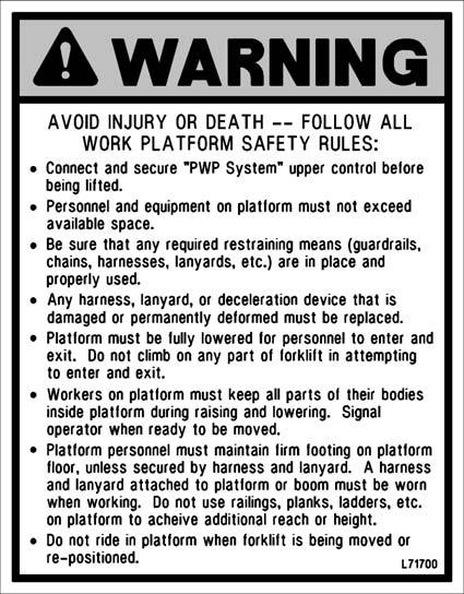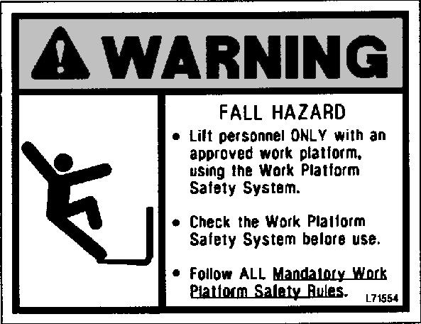 NEVER exceed the specified lift and reach capacities of the machine, or serious machine damage and personal injury may result. Refer to the load charts at the operator’s station or this manual.