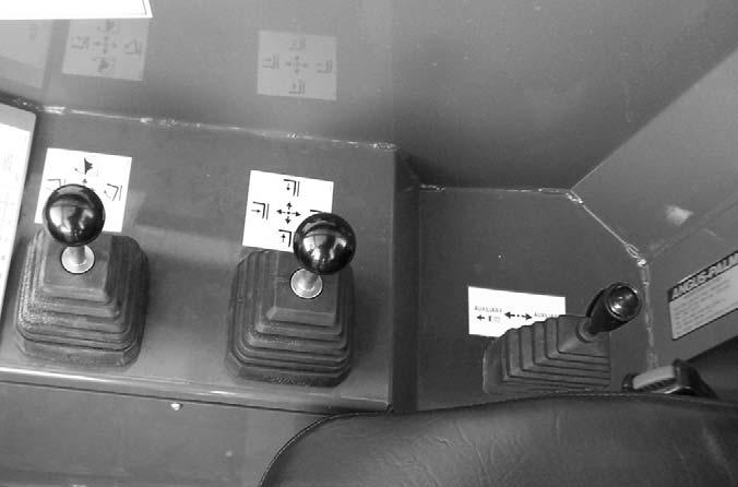 This machine is equipped with one of two types of boom and attachment joystick control configurations, either a two-joystick configuration, or a single tri-function joystick.
