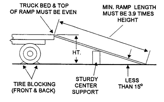 3.The incline of the ramps MUST be less than 15 degrees. For a four-foot high truck bed, ramp length must be at least 16 feet (4.9 m) long.