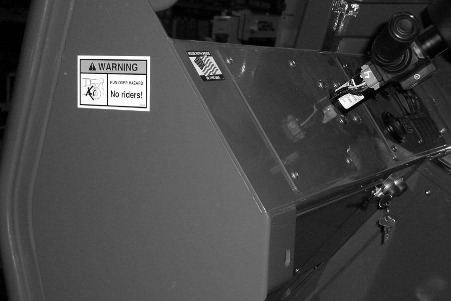 This machine is equipped with a horn and backup alarm. The user must determine if operating conditions require the machine to be equipped with additional devices (mirrors, rotating beacon, etc.) and be responsible for providing and maintaining such devices.