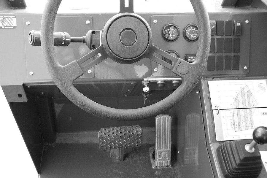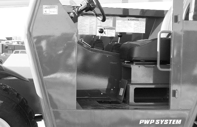 Seat Positioning: The seat is mounted on rails for forward and rearward repositioning, for comfort and to accommodate the operator’s size. Aspring-loaded latch handle under the front of the seat actuates the adjustment mechanism.