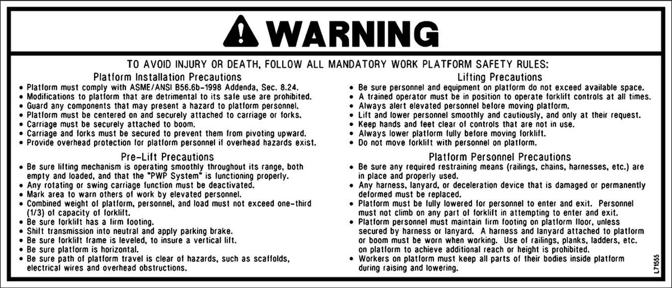 Read and thoroughly understand all safety decals on the Telescopic Handler BEFORE operating it. DO NOT operate the machine unless all factory-installed guards and shields are properly secured in place.