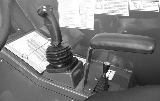This machine is equipped with one of two types of boom and attachment joystick control configurations, either a two-joystick configuration, or a single tri-function joystick.