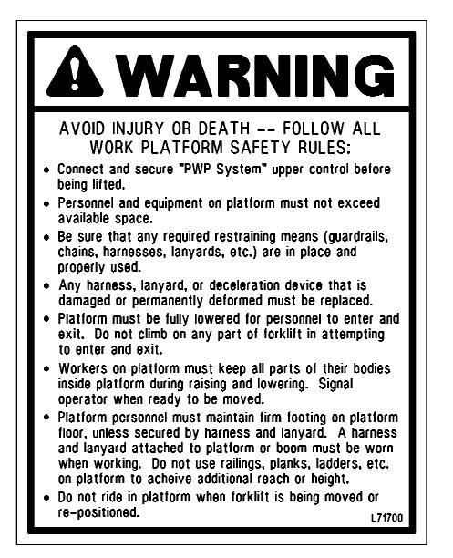 NEVER exceed the specified lift and reach capacities of the machine, or serious machine damage and personal injury may result. Refer to the load charts in the operator’s station or this manual.