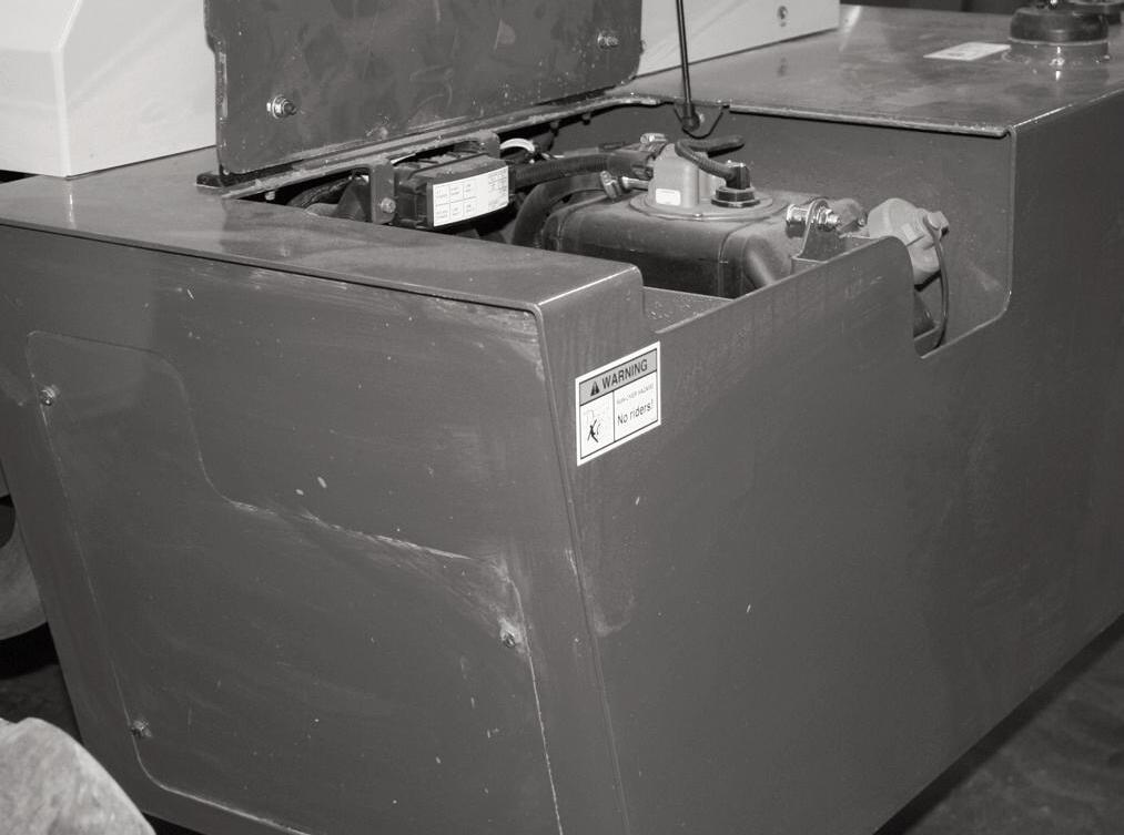 Battery Compartment: The batteries are located in the compartment on the right side of the machine to the rear of the fuel tank. Open the top access door using the ignition key if locked to check the electrolyte level. Remove the access panel to the rear of the battery compartment to remove the batteries.