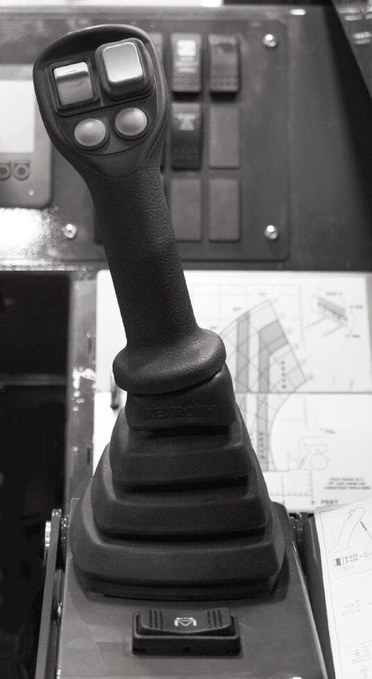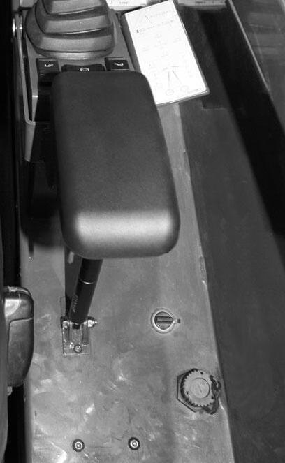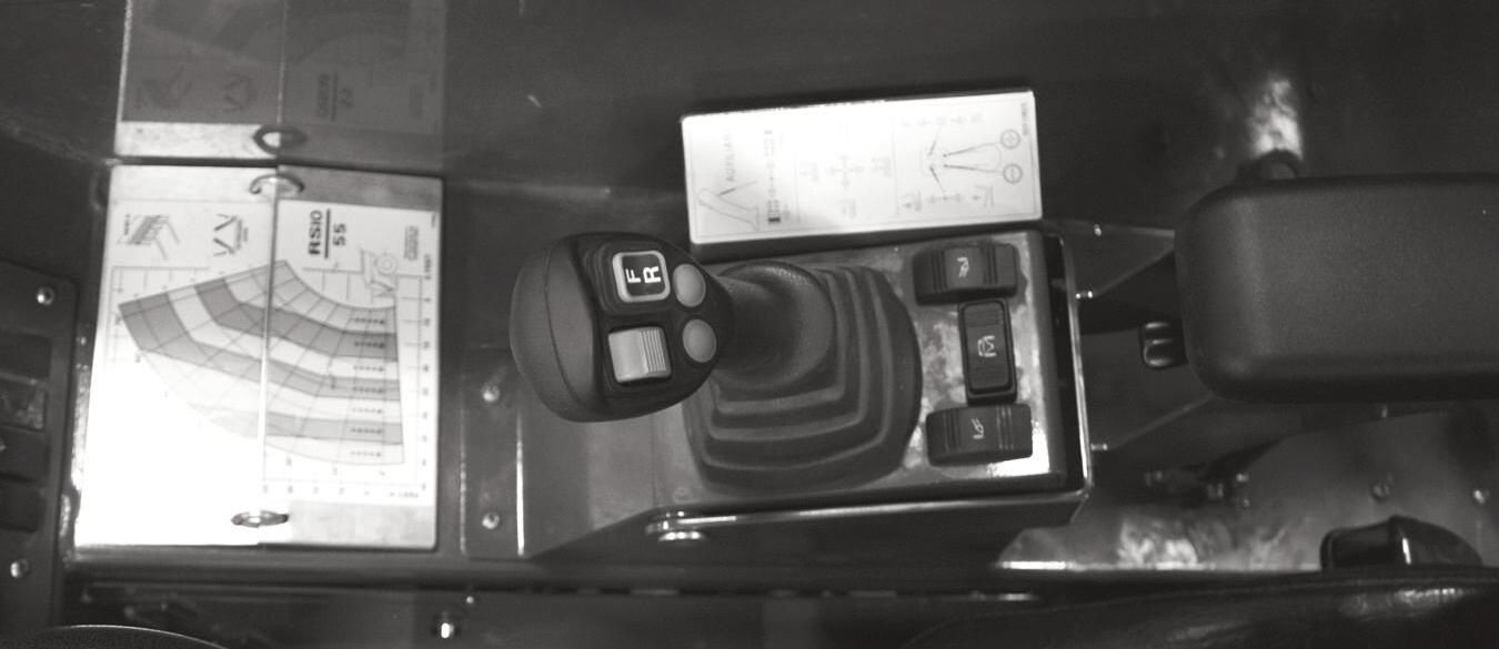 E - Head Lights/Work Lights: Pressing the top of the switch will illuminate the lights mounted on the top of the operator’s station and the red tail lights, for use in forward travel operations. Pressing the bottom of the switch will illuminate the lights at the end of the boom in addition to the lights on the operator’s station, for additional lighting in working operations.