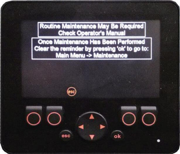 Refer to the Service and Storage chapter to determine the required maintenance for the hours on the machine. Once the maintenance has been performed, the routine maintenance reminder can be cleared by navigating to the maintenance menu. Once you select the maintenance menu, clear the message by pressing and holding the OK button for 3 seconds.