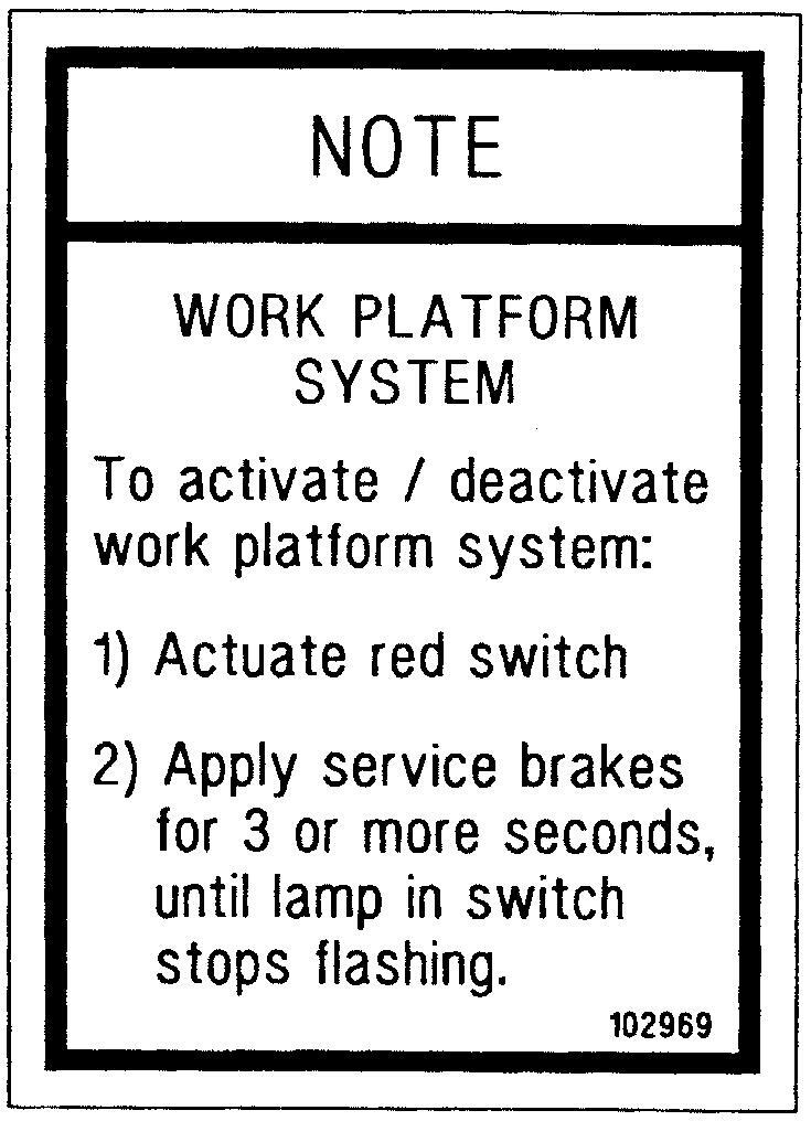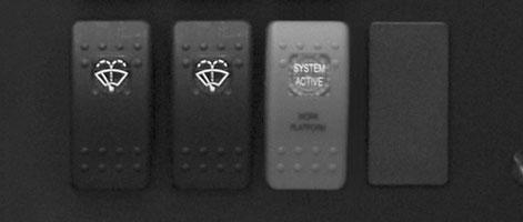 The switch must be pressed within 30 seconds of the engine shutdown signal from the ECU to prevent undesired shutdown of the engine. Pressing the switch will override the engine shutdown for 30 seconds at a time to move the machine to a safe location and to lower the boom to the ground. If the engine shuts down, the ignition switch must be turned off for 30 seconds and then back on before the engine can be restarted.
