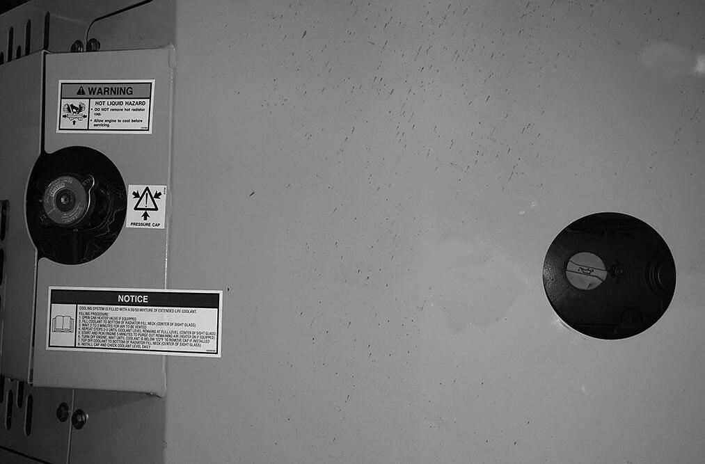 Coolant Level: Coolant level can be checked through the sight glass on the back side of the radiator. Coolant can be added through the radiator cap located in the top rear opening on the main hood.