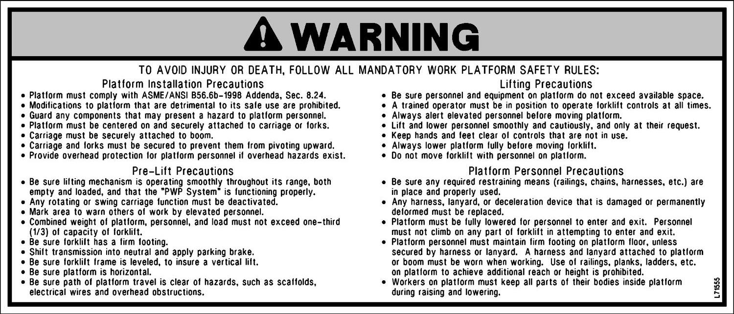 Read and thoroughly understand all safety decals on the Telescopic Handler BEFORE operating it. DO NOT operate the machine unless all factory-installed guards and shields are properly secured in place.