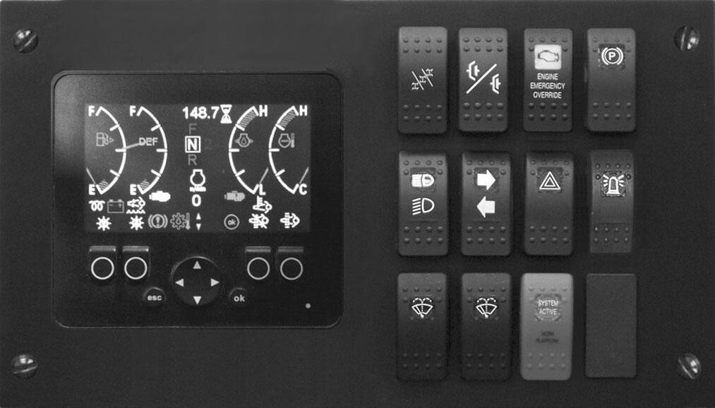 The switch panel contains three rows of switches for the operation of standard and optional equipment on the telescopic handler.