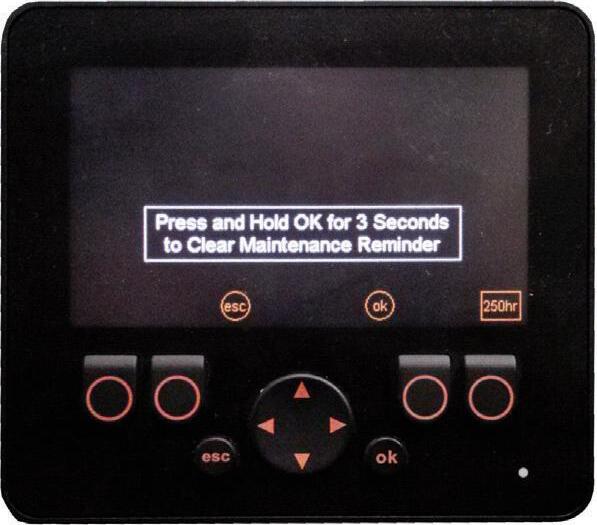Maintenance: Use the up and down scroll button to highlight the Mainteneance function, then press the OK button. The 250 hour mantenance reminder can be disable by pressing the (G) button below 250hr box. This will change the 250hr in the box to OFF. The routine maintenance reminder can be re-activated any time by following the same procedure and pressing the (G) button so that the box reads 250hr. Press the escape button to return to the operation gauges and icons screen.