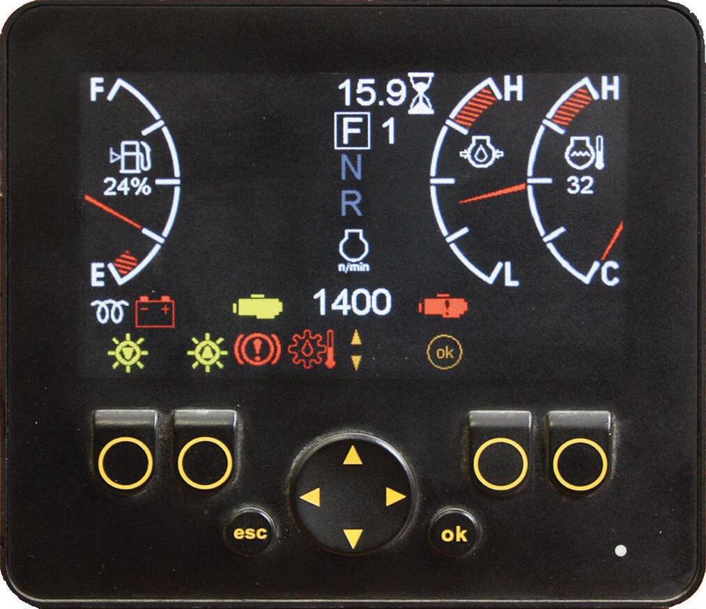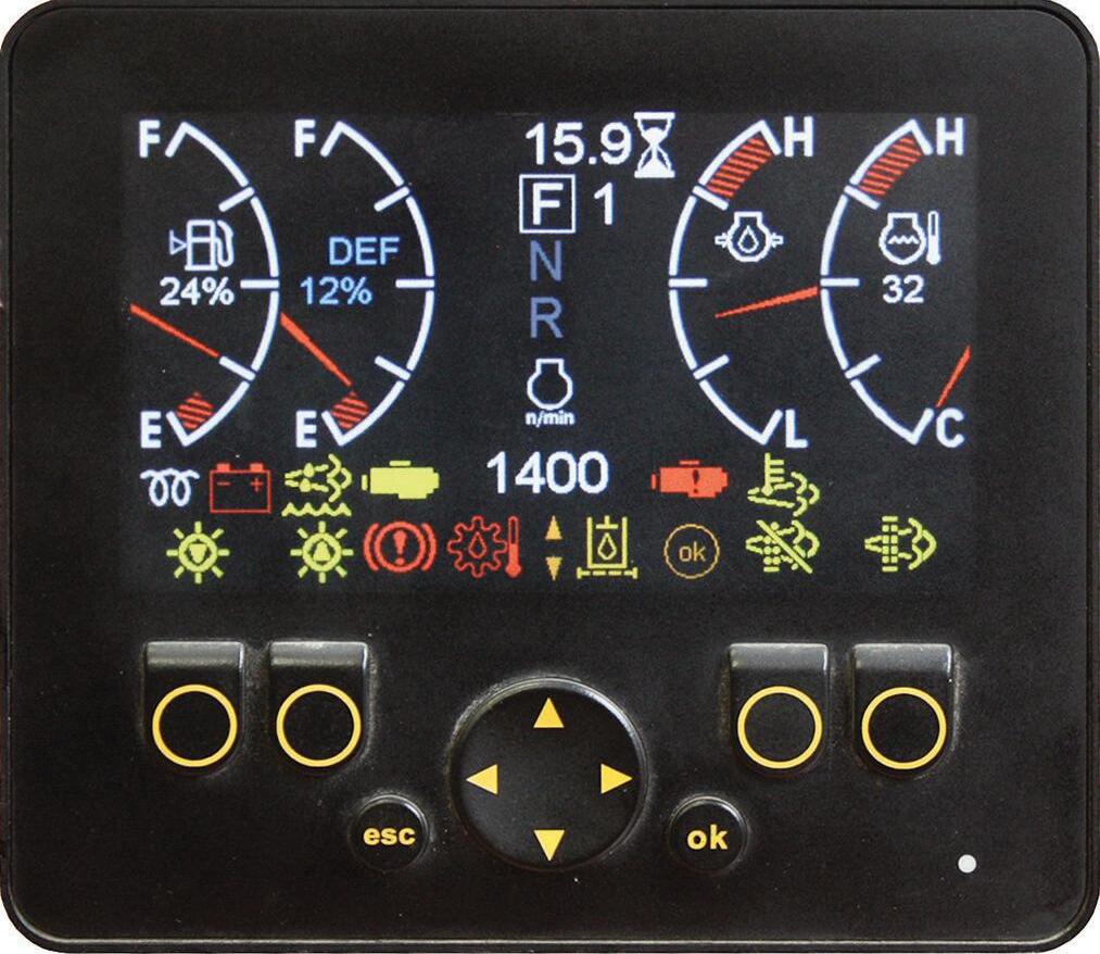 If the machine is equipped with the 120 hp engine, it will have a multi-functional display that includes a gauge for the Diesel Exhaust Fluid (DEF) level.