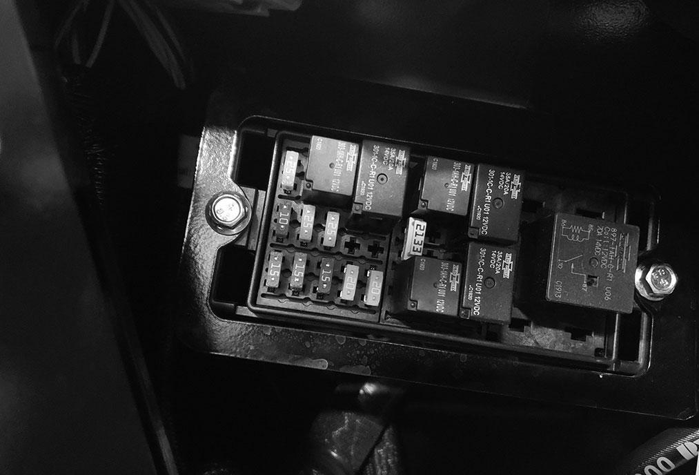 Battery Compartment Fuse and Relay: This compartment is located on the right side of the machine to the rear of the fuel tank. Use the igniton key to open the locked door to gain access to the fuses and relays.