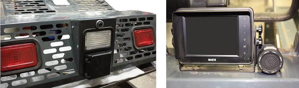 This system consists of the rearview camera (1) mounted at the rear of the machine and the viewing monitor (2) mounted on the right side of the dash. This system provides a visual view of the area directly behind the machine.