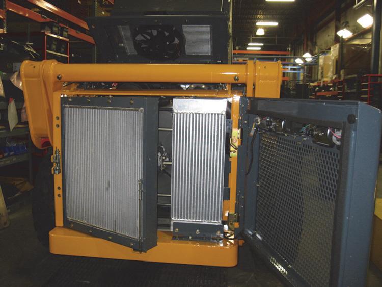 Additionally, the radiator swings out for service (Figure34). Pull up the spring-loaded latch that secures the radiator to the chassis bumper and place the latch grip in its welded tab placeholder, then pull the radiator outward.