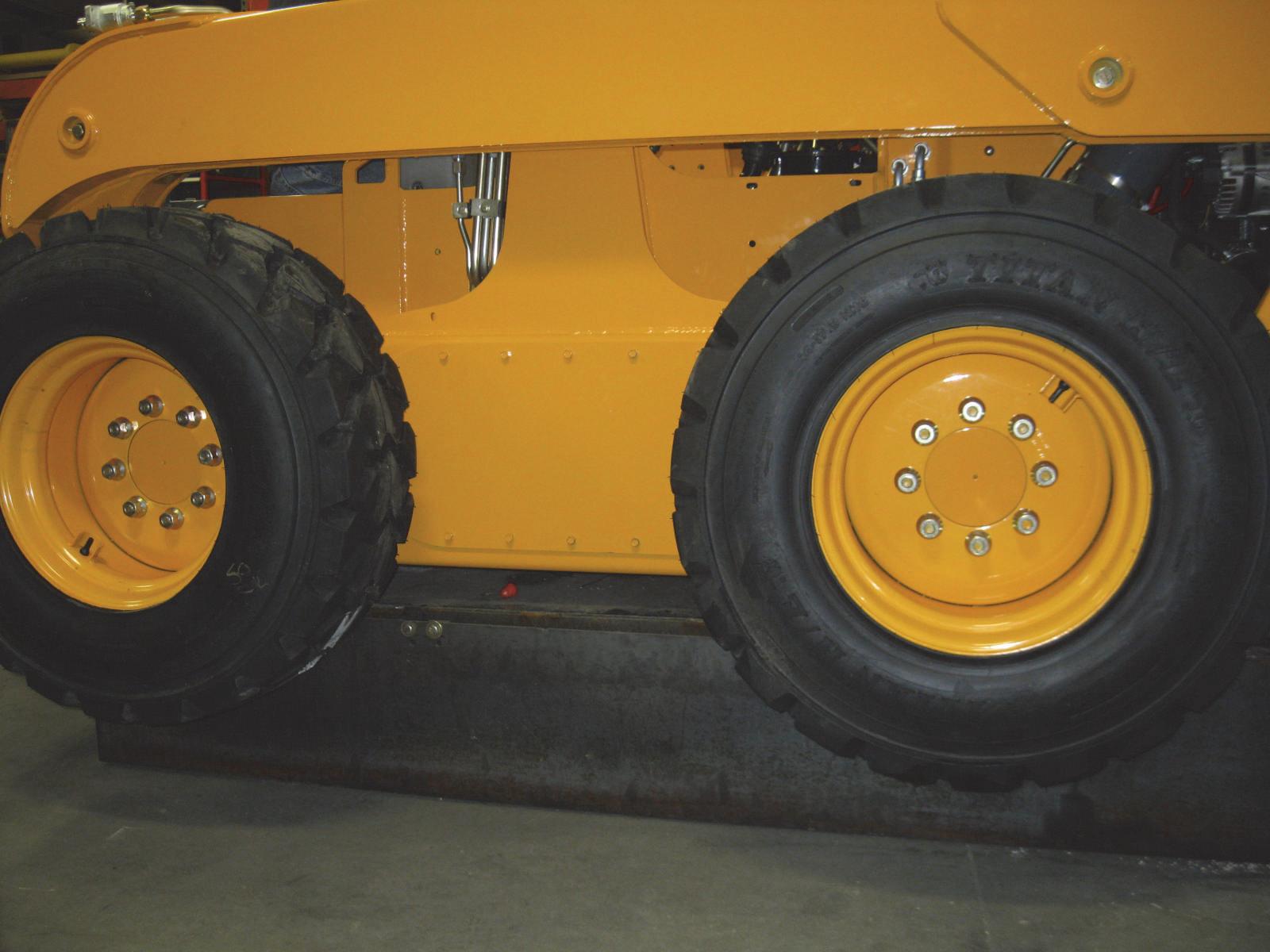 4.Repeat steps 1 through 3 for the rear of the loader. When the procedure is finished, all four tires will be on the ground and the blocks removed from under the loader.