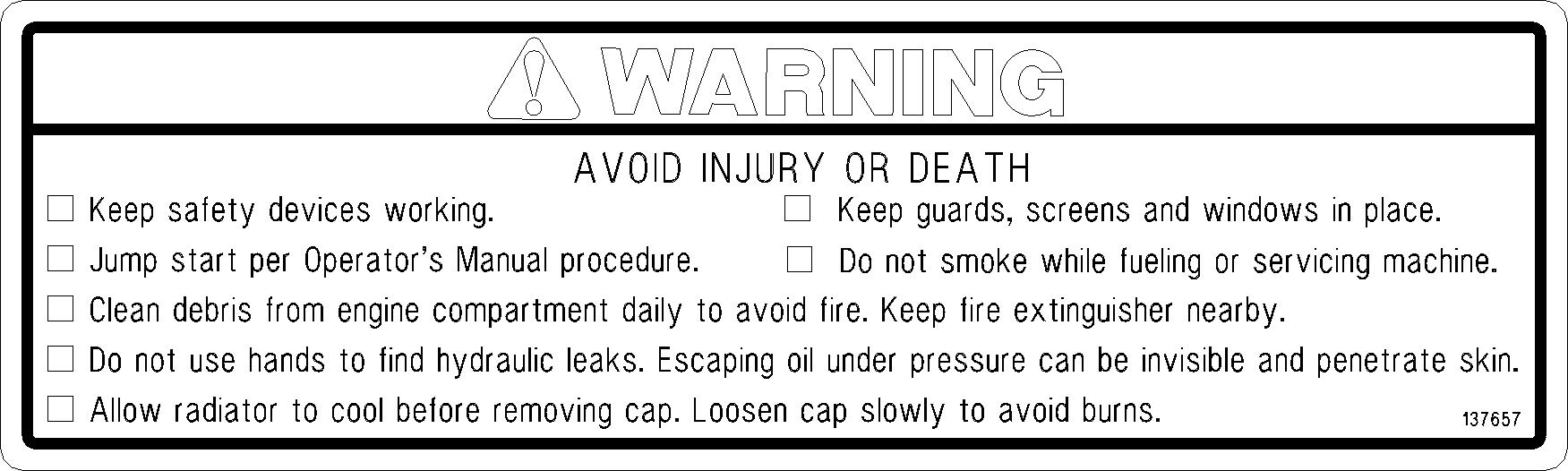 Coolant must be topped off after radiator has been drained and refilled. Operate unit untilthermostat has opened,then shutoff. Allow radiator to cool before opening cap. Top off with coolant.