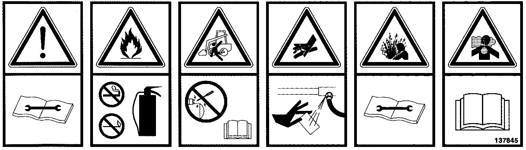 D – Oil injection hazard: Do not use hands to find hydraulic leaks. Escaping oil under pressure can be invisible and penetrate skin. Use a piece of cardboard to find leaks.