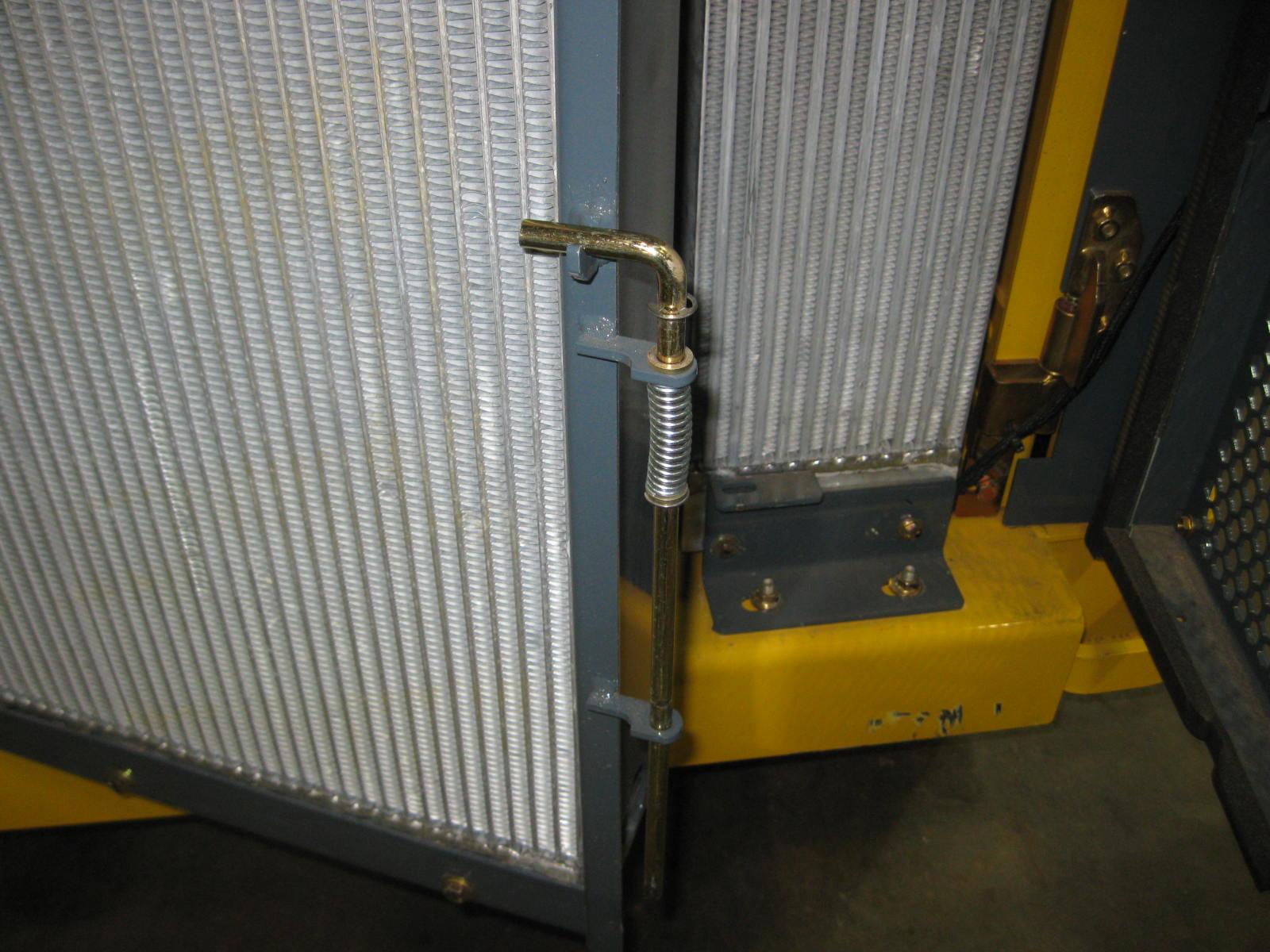 The radiator assembly is mounted between the engine and the hinged rear door. When operating correctly, air is blown through the openings between the fins by the engine fan. During operation dust and debris can build up on the engine side of the radiator and restrict air flow through the fins. To remove this restriction, use compressed air and direct the flow through the fins from the rear of the radiator toward the engine.