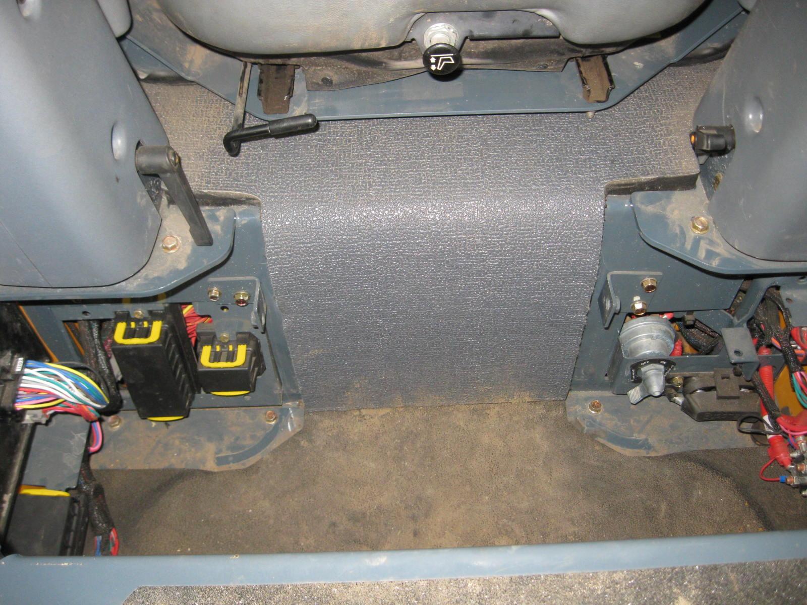 The batteries on the machine are 12-volt, group 24, wet-cell batteries. To access the batteries, remove the floor mat and pull up on the center foam cover (Fig.25) between the control handles to release it from its fasteners, then remove the metal cover beneath the crossmember.