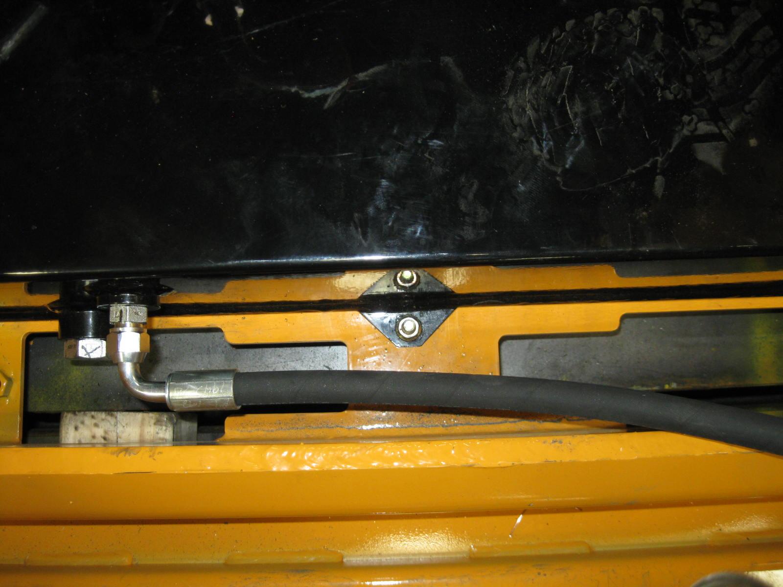 The hydraulic oil filter element is located underneath a flat cover plate on top of the reservoir tank. To change the hydraulic filter element: