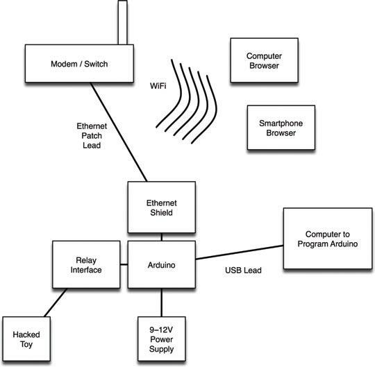 Connect everything up as shown in Figure 6-26 and load the sketch “web_relay” into the Arduino IDE. Don’t upload it onto the Arduino itself just yet. There are some configuration changes we need to make first.