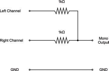 Stereo audio is made up of two slightly different audio signals that give the stereo effect when played through two separate speakers. Sometimes, you have a stereo output that you want to input to a single channel (mono) amplifier. You could use just one of the channels of the stereo signal (say, the left channel), but then you will lose whatever is on the right channel. So a better way of converting stereo to mono is to use a pair of resistors to mix the two channels into one (Figure 9-4).