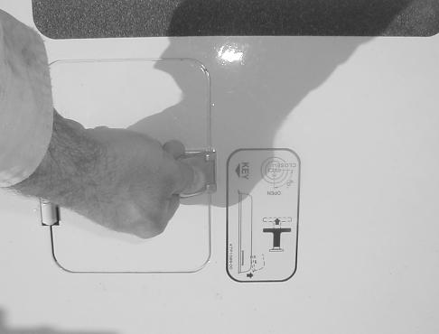 Use the outside handle to open the doors. To hold the doors, open, remove the struts from their storage position and install them in the holes provided. When closing, put the struts back into storage position.