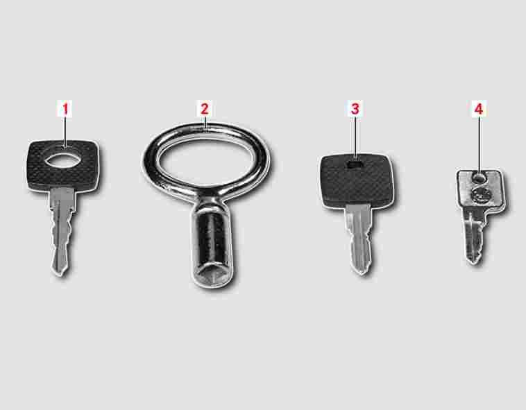 1 Key for the ignition switch 2 Key for: Doors, interior and exterior flaps 3 Key for (option): Doors, interior and exterior flaps 4 Key for key switch: Lowering system, ramp, disabled passengers' lift At a glance