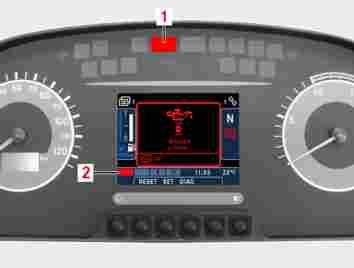 M54.00-1819-71 Red warning level malfunctions are displayed immediately in conjunction with red warning lamp (1) in the instrument cluster and remain active until the malfunctions themselves have been rectified. A warning signal also sounds and the red status indicator lights up on display screen (2). It is not possible to clear the malfunction display or switch to a different display mode.
