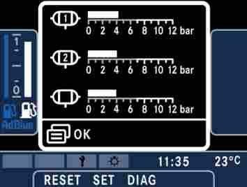 M54.00-1706-71 After the ignition starter switch has been switched to ON, the first display to appear on the display screen is the standby screen with the marque logo. If a fault occurs at this point, a corresponding fault alert will be displayed. If no fault occurs, the system checks whether there are any event notifications present. If there are, the associated pop-up window opens and the driver has to acknowledge the event notifications in order of their urgency. The system then verifies whether the supply pressures for the various compressed-air circuits are at acceptable levels. If so, the bus graphic in the “Vehicle” main menu is then displayed. However, if a supply pressure is too low, which may be the case if the vehicle has been parked up for a long period, a pop-up window displaying the supply pressures for the various compressed-air circuits opens (see illustration). The pop-up window closes automatically as soon as the necessary operating pressure is reached. If the driver acknowledges the pop-up window using the main menu buttons on the steering wheel before the correct pressure has been reached, another pop-up window opens and displays a red alert informing the driver once more that the operating pressure is still too low. If the necessary operating pressure is now reached, or if the driver acknowledges the red alert, the bus graphic in the “Vehicle” main menu will be displayed.