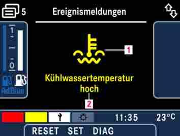 M54.00-1709-71 Each event notification has its own submenu in which the notification is explained in more detail. In these submenus, symbol (1) is supplemented by two lines of text (2). The display layout is the same regardless of the notification category.