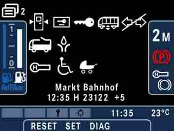 The driver can select menus manually using the buttons on the steering wheel. In addition, provided specific conditions are fulfilled, the menus alternate between the “Doors and flaps” submenu and the “Driver assistance systems and navigation splitscreen” or “Driver assistance system” submenu automatically so that the driver is always provided with all the necessary information while the bus is stationary or in motion without the driver having to select these menus manually.